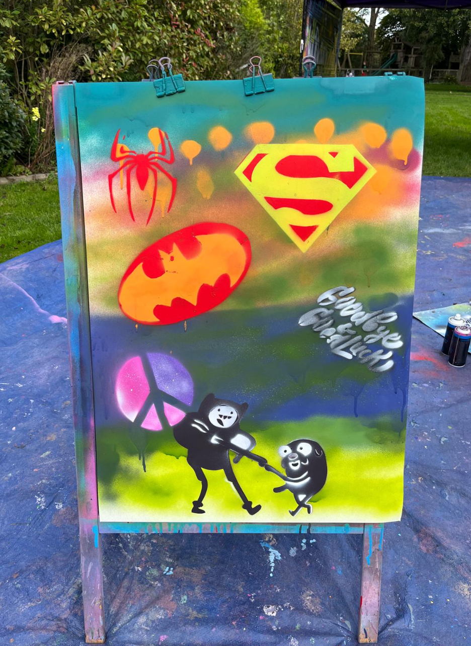 You will also be able to paint some slightly smaller sheets of cardboard, you can paint anything you like including abstract painting combing the use of pre cut stencils. (Which will be provided)